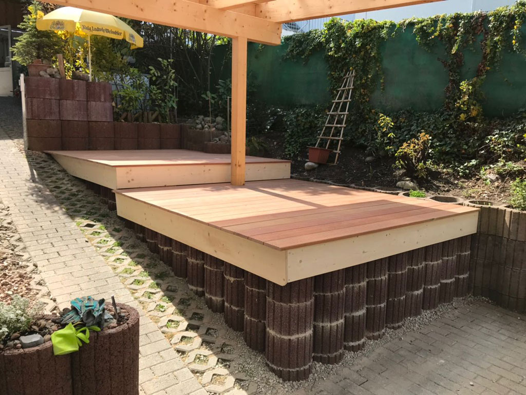 Unsere Holz-Terrassen: Ausgewählt aus resistenten Holzarten, welche aufgrund Ihrer Eigenschaften jahrelang den Witterungseinflüssen standhalten und Ihrem Besitzer einen warmen Ton entgegen spiegeln.